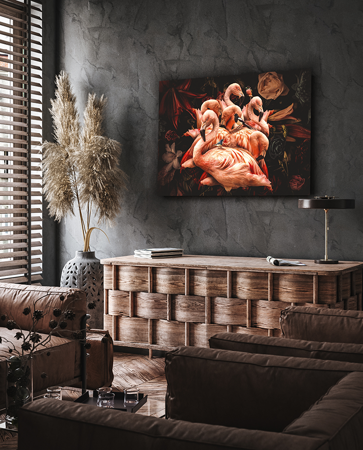 Op dit kleurrijke exemplaar is de "Flamingo Rosa" zichtbaar omringt door verschillende soorten bloemen. Dit exemplaar geeft een "classy" look aan uw interieur.
