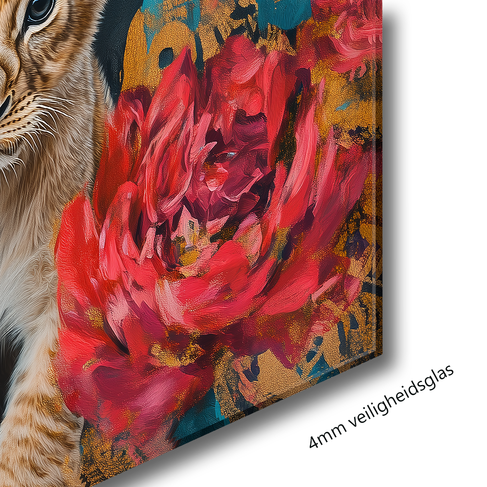 Glasschilderij - Exclusive - Liggend - De Beschermer Leeuwenfamilie 1 Welp