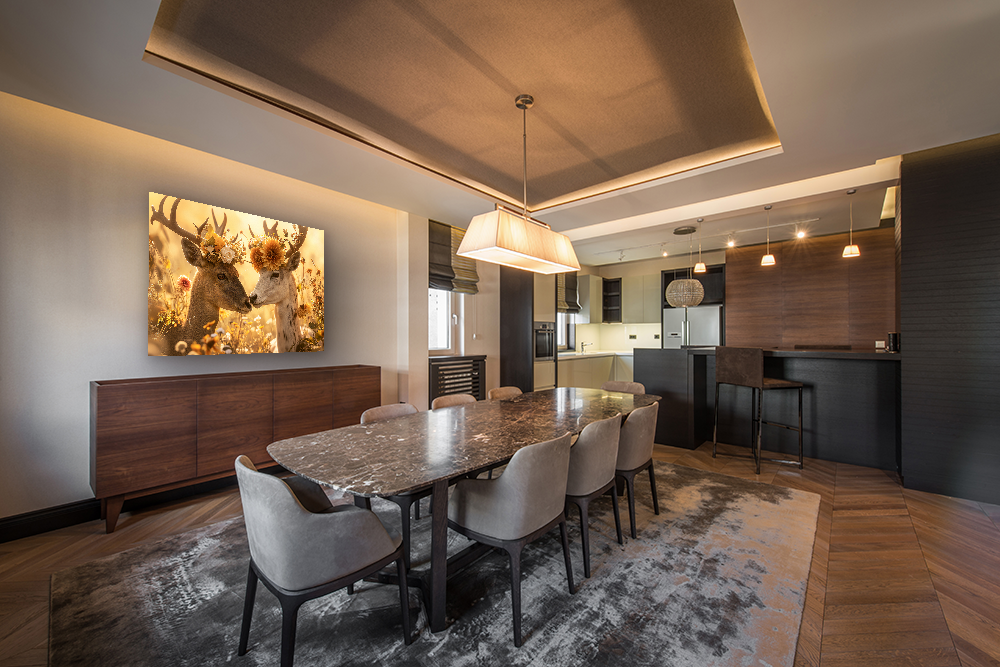 • Hang het schilderij op een stabiele en droge muur, buiten direct en langdurig zonlicht. Hoewel het glas zonlicht goed verdraagt, kan constante UV-blootstelling na verloop van tijd invloed hebben op de ophangsystemen.