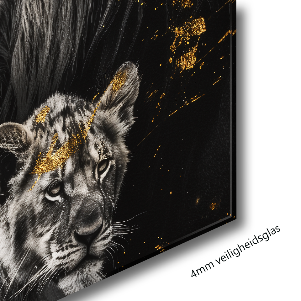 Glasschilderij - Exclusive - Liggend - Leeuwenfamilie 1 Welpje Carmen - Gouden Eeuw Serie
