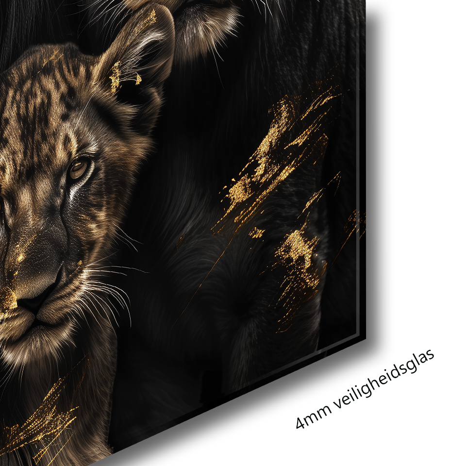 Glasschilderij - Exclusive - Liggend - Leeuwenfamilie 3 Welpjes de Grote Brul - Gouden Eeuw Serie