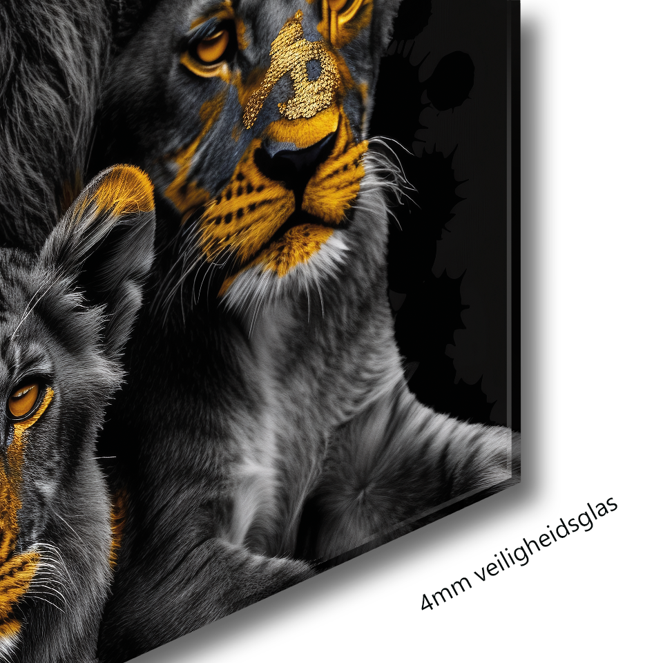 Glasschilderij - Exclusive - Liggend - Leeuwenfamilie 3 Welpjes Nora - Gouden Eeuw Serie