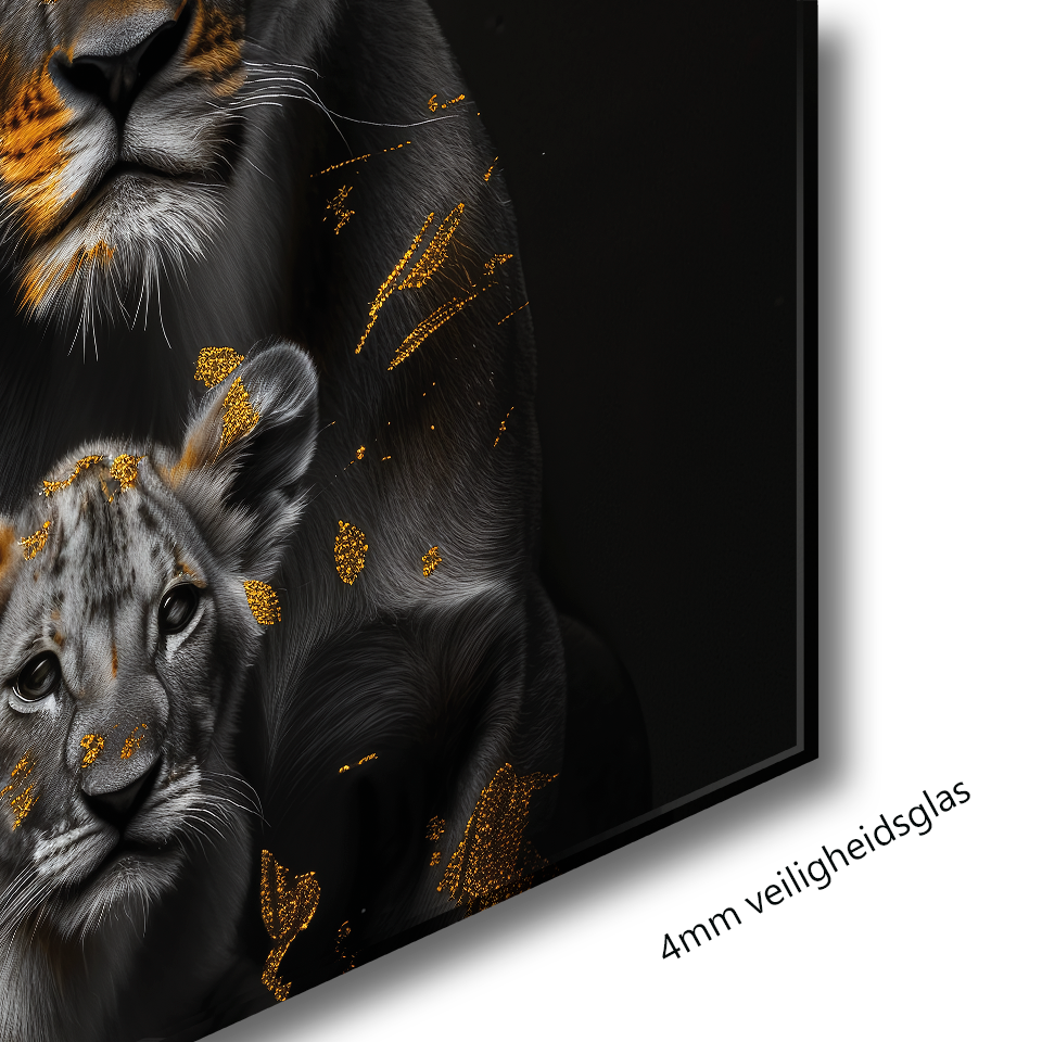Glasschilderij - Exclusive - Liggend - Leeuwenfamilie 4 Welpen, Zanten - Gouden Eeuw Serie