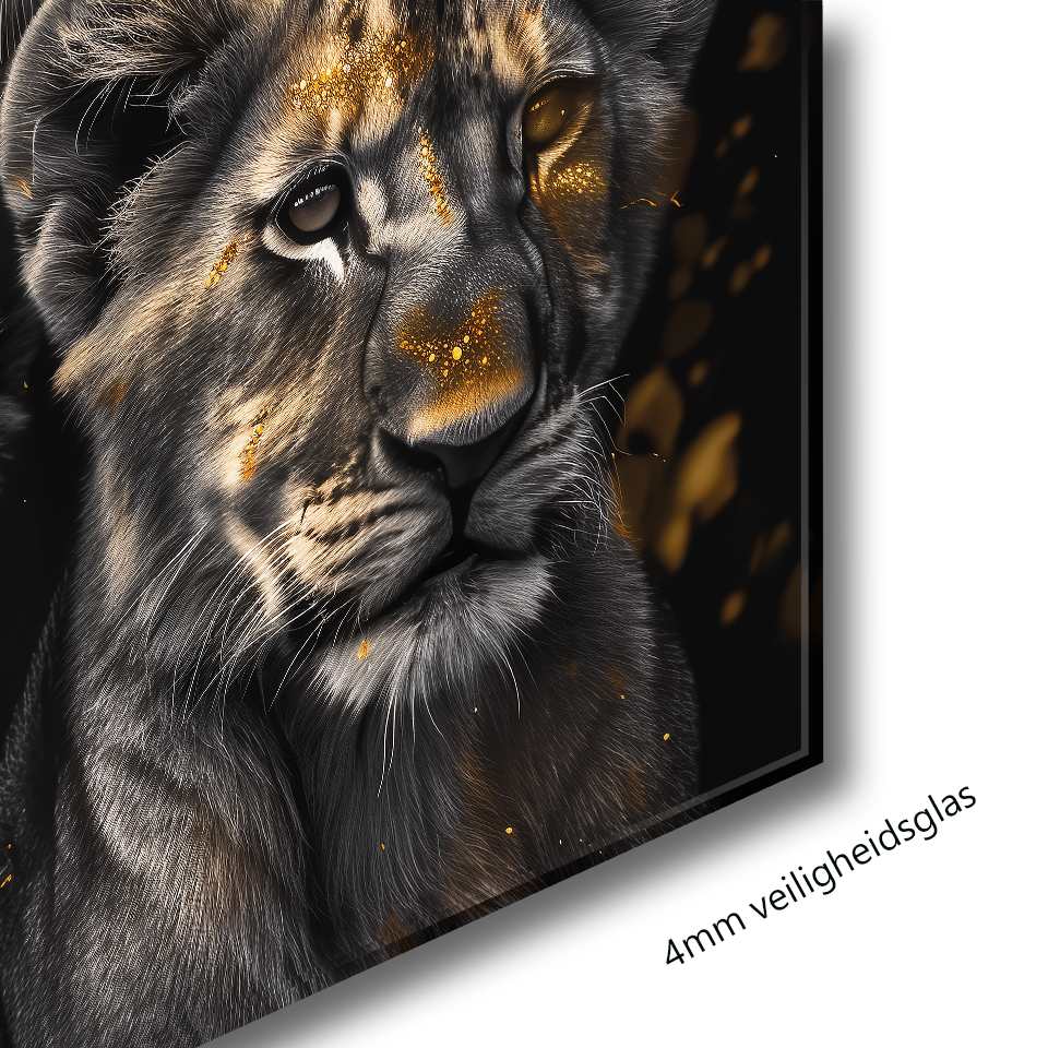 Glasschilderij - Exclusive - Staand - Leeuwenfamilie 2 Welpjes, Middernacht - Gouden Eeuw Serie